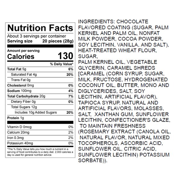 Delicious Cookie Dough coated in creamy milk chocolate with caramel bits and caramel flavor.
