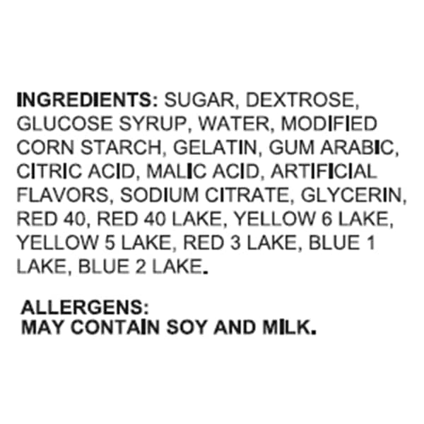 Delicious ring-shaped gummies coated with crunchy dextrose candy in top 3 SOUR fruit flavors of Blue Raspberry, Watermelon & Green Apple.
